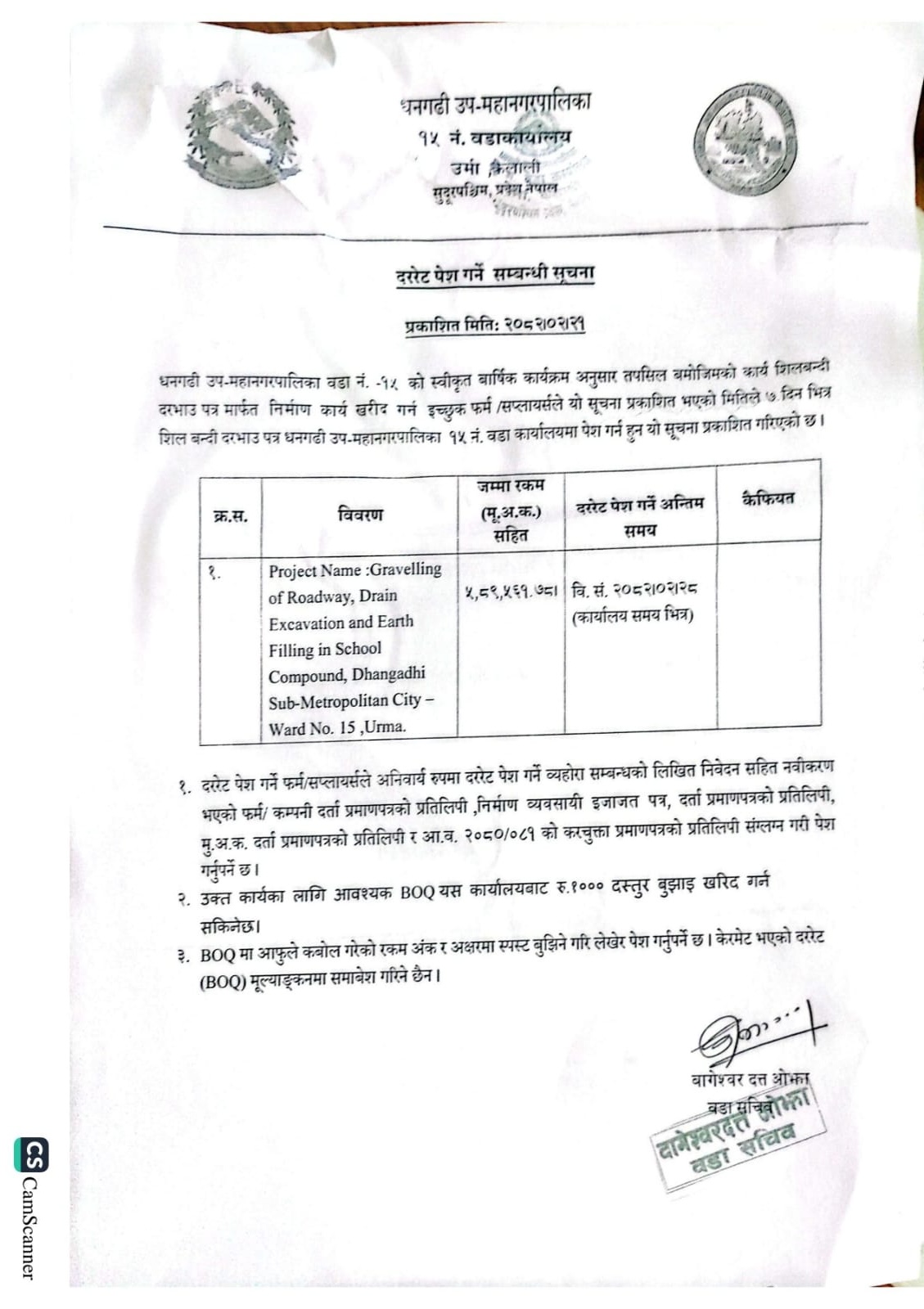 वडा नं १५ को कार्यालयको दररेट पेश गर्ने सम्बन्धी सूचना [Gravelling of Roadway, Drain Excavation and Earth Filling in School Compound, Dhangadhi Sub-metropolitan City Ward no 15, Urma]