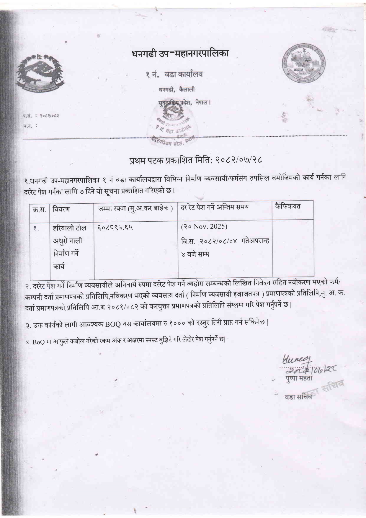 वडा नं १ को कार्यालयको दररेट पेश गर्ने सम्बन्धी सूचना [हरियाली टोल अधुरो नाली निर्माण गर्ने कार्य]