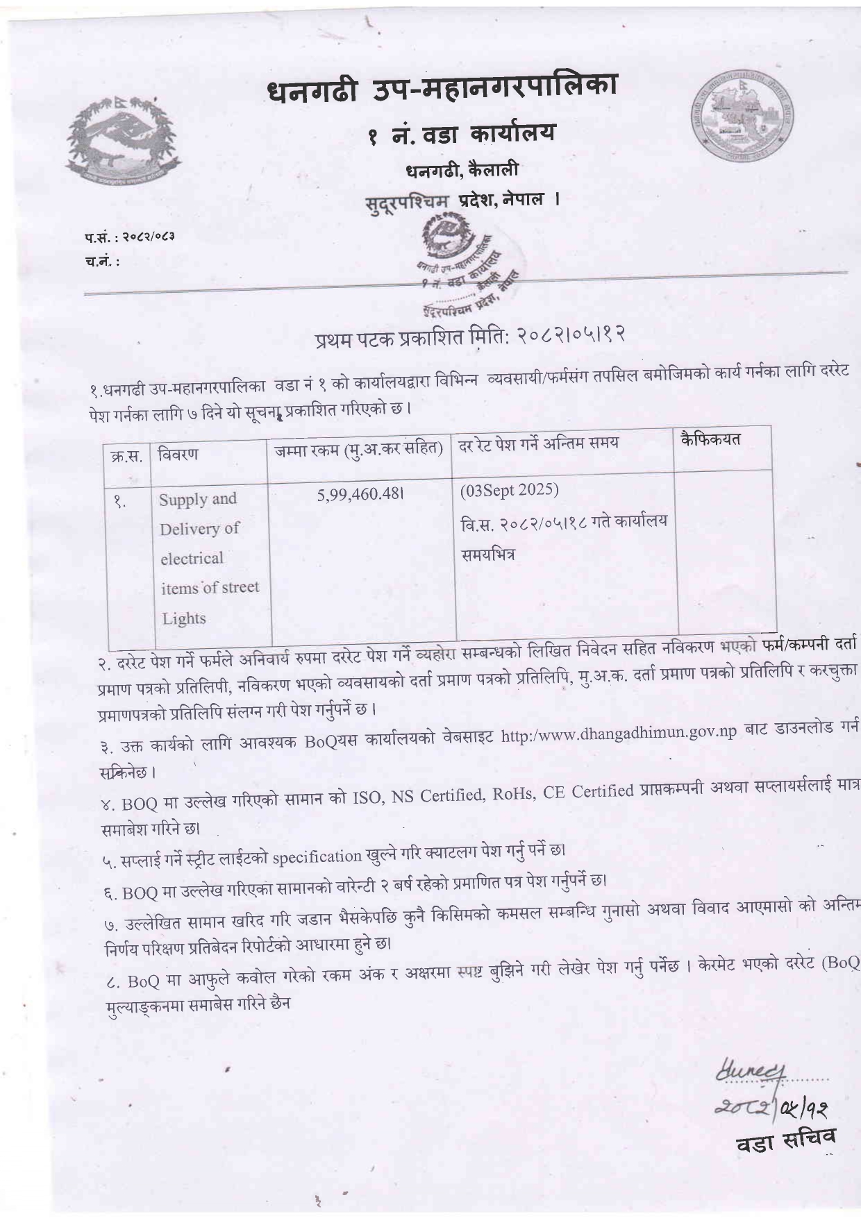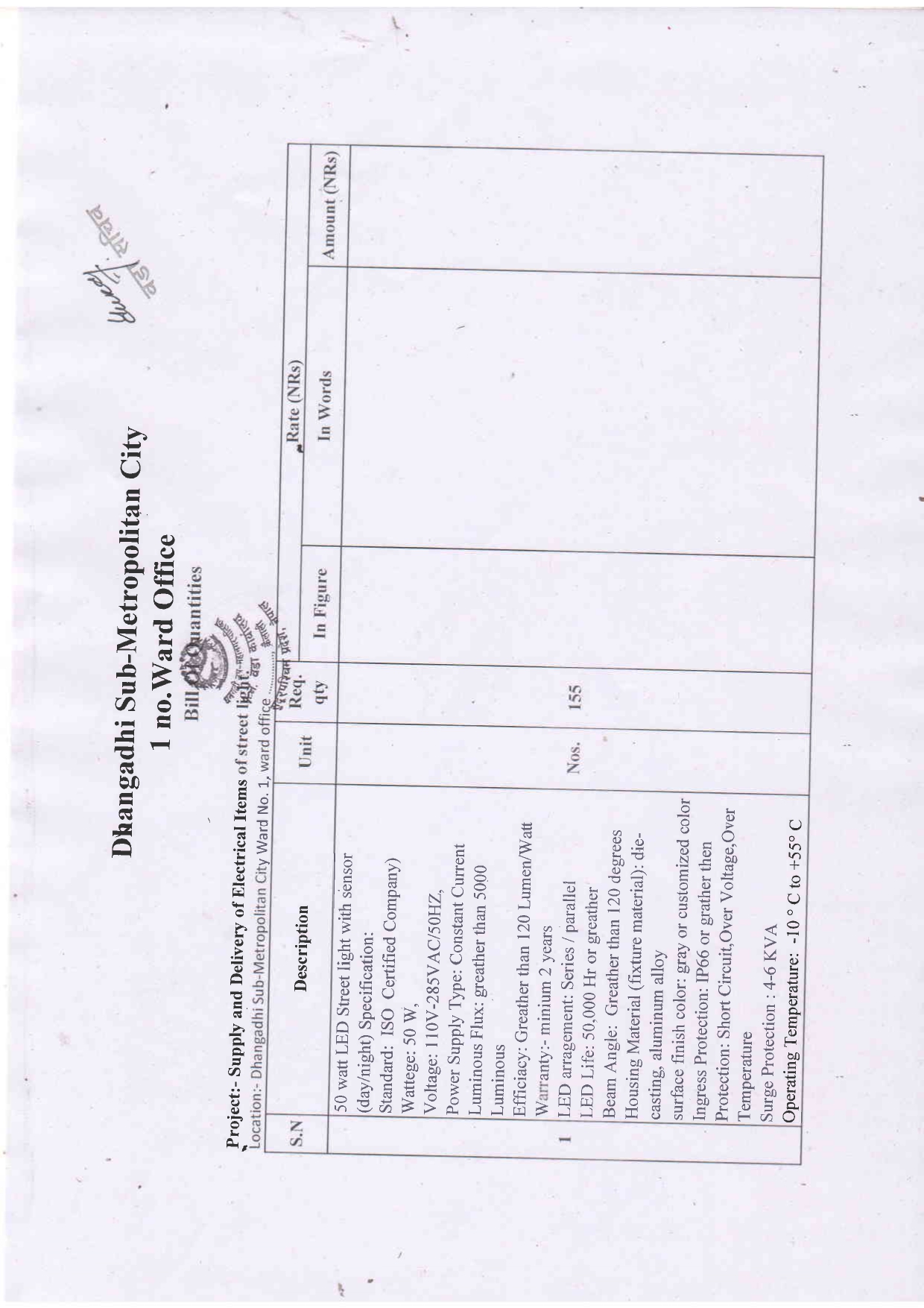 » वडा नं १ को कार्यालयको दररेट पेश गर्ने सम्बन्धी सूचना (Supply and Delivery of Electrical Items of street Lights)