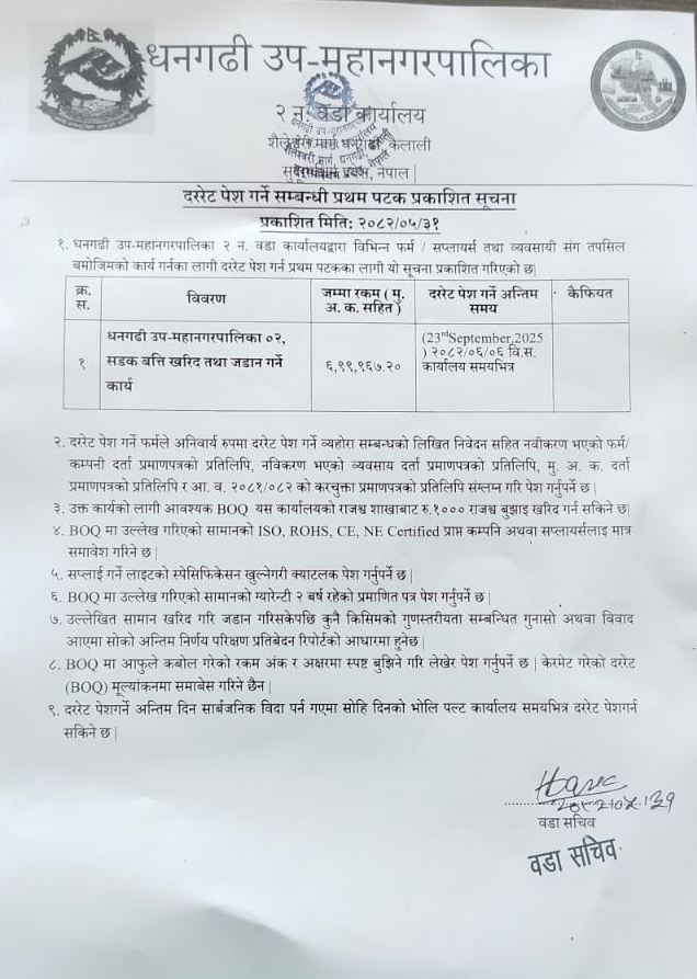 वडा नं २ को कार्यालयको सडक बत्ति खरिद तथा जडान गर्ने कार्यका लागि दररेट पेश गर्ने सम्बन्धी प्रथम पटक प्रकाशित सूचना