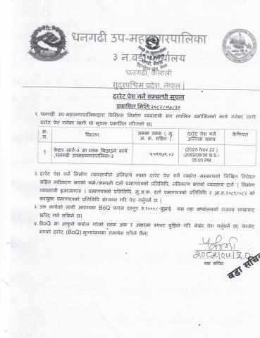 वडा नं ३ को कार्यालयको दररेट पेश गर्ने सम्बन्धी सूचना (केदार मार्ग -०३ मा ब्लक बिछाउने कार्य, धनगढी उपमहानगरपालिका)
