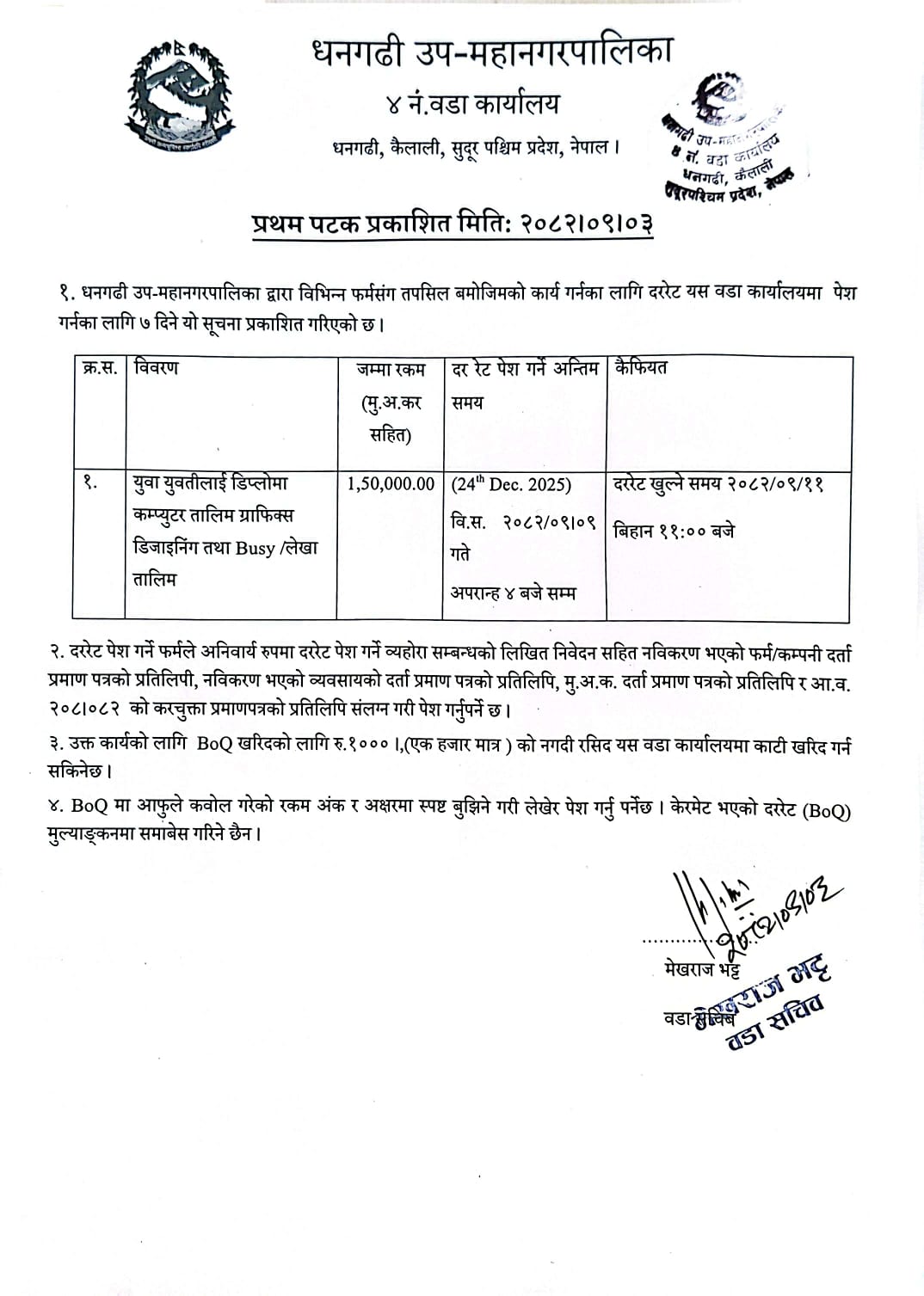 वडा नं ०४ को दररेट पेश गर्ने सम्बन्धी सूचना [युवा युवतीलाई डिप्लोमा कम्प्युटर तालिम ग्राफिक्स डिजाइनिंग तथा लेखा तालिम]