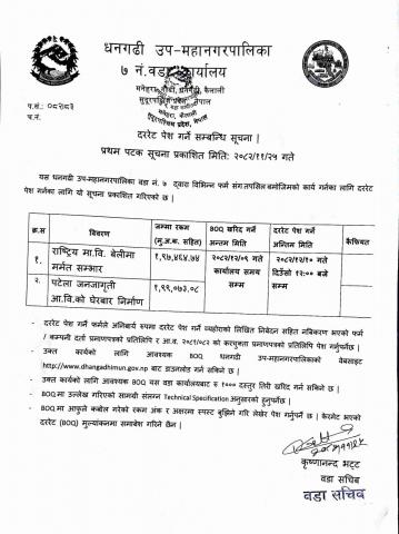 » वडा नं ७ को कार्यालयको दररेट पेश गर्ने सम्बन्धी सूचना (राष्ट्रिय मा.वि. बेलीमा मर्मत सम्भार/पटेला जनजागृती आ.वि. को घेरबार निर्माण)