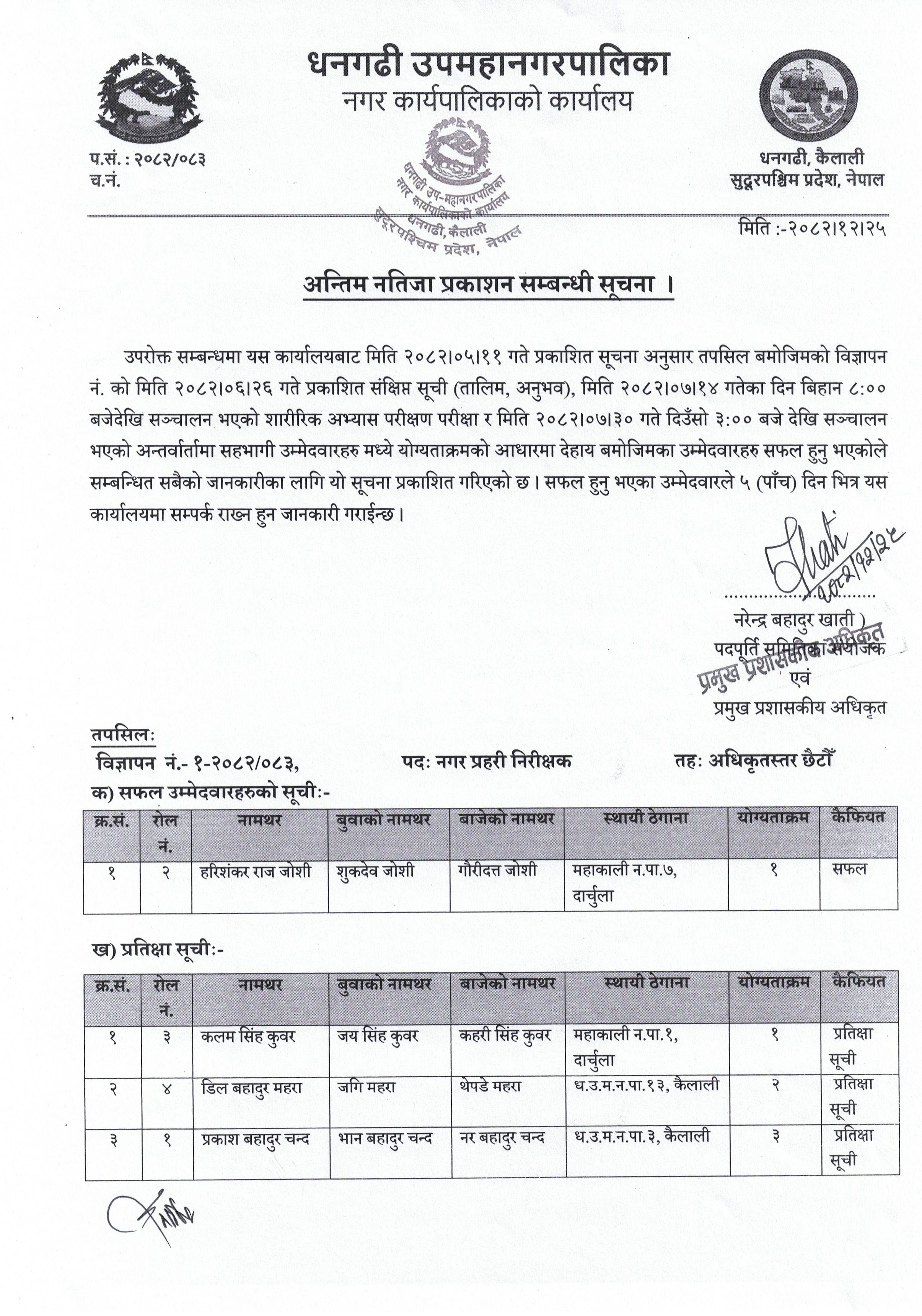 विज्ञापन नं १- २०८२/२०८३ , नगर प्रहरी निरीक्षकको अन्तिम नतिजा प्रकाशन सम्बन्धी सूचना ।