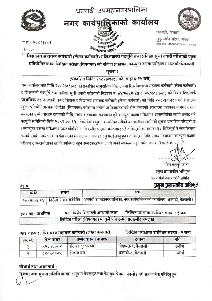 विद्यालय सहायक कर्मचारी (लेखा कर्मचारी) र शिक्षकको पदपूर्ति तथा प्रतिक्षा सूची तयारी परीक्षाको खुला प्रतियोगितात्मक लिखित परीक्षा (विषयगत) को नतिजा प्रकाशन, कम्प्युटर दक्षता परीक्षण र अन्तर्वार्तासम्बन्धी सूचना !