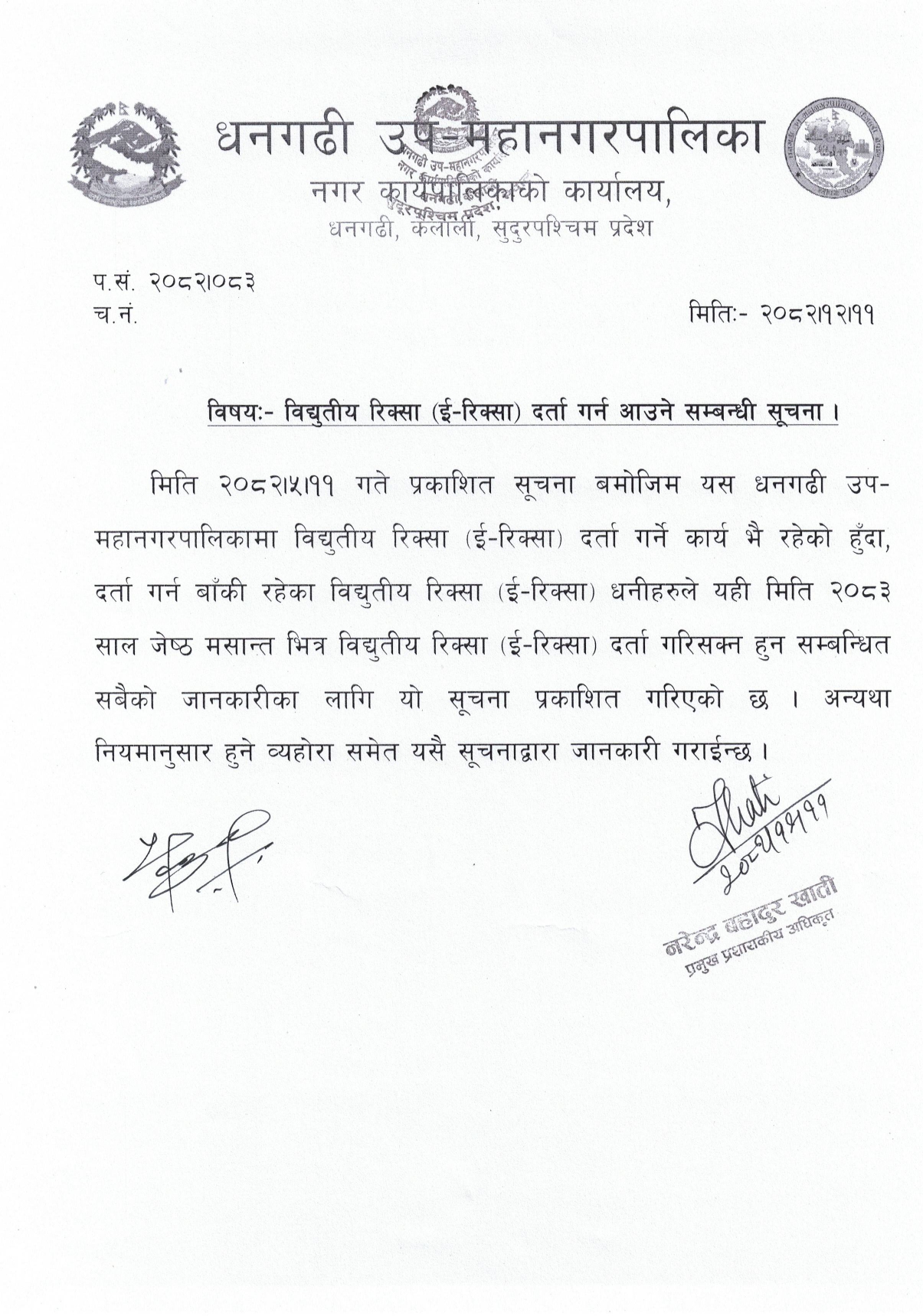 » विद्युतीय रिक्सा (इ-रिक्सा) दर्ता गर्न आउने सम्बन्धी सूचना ।