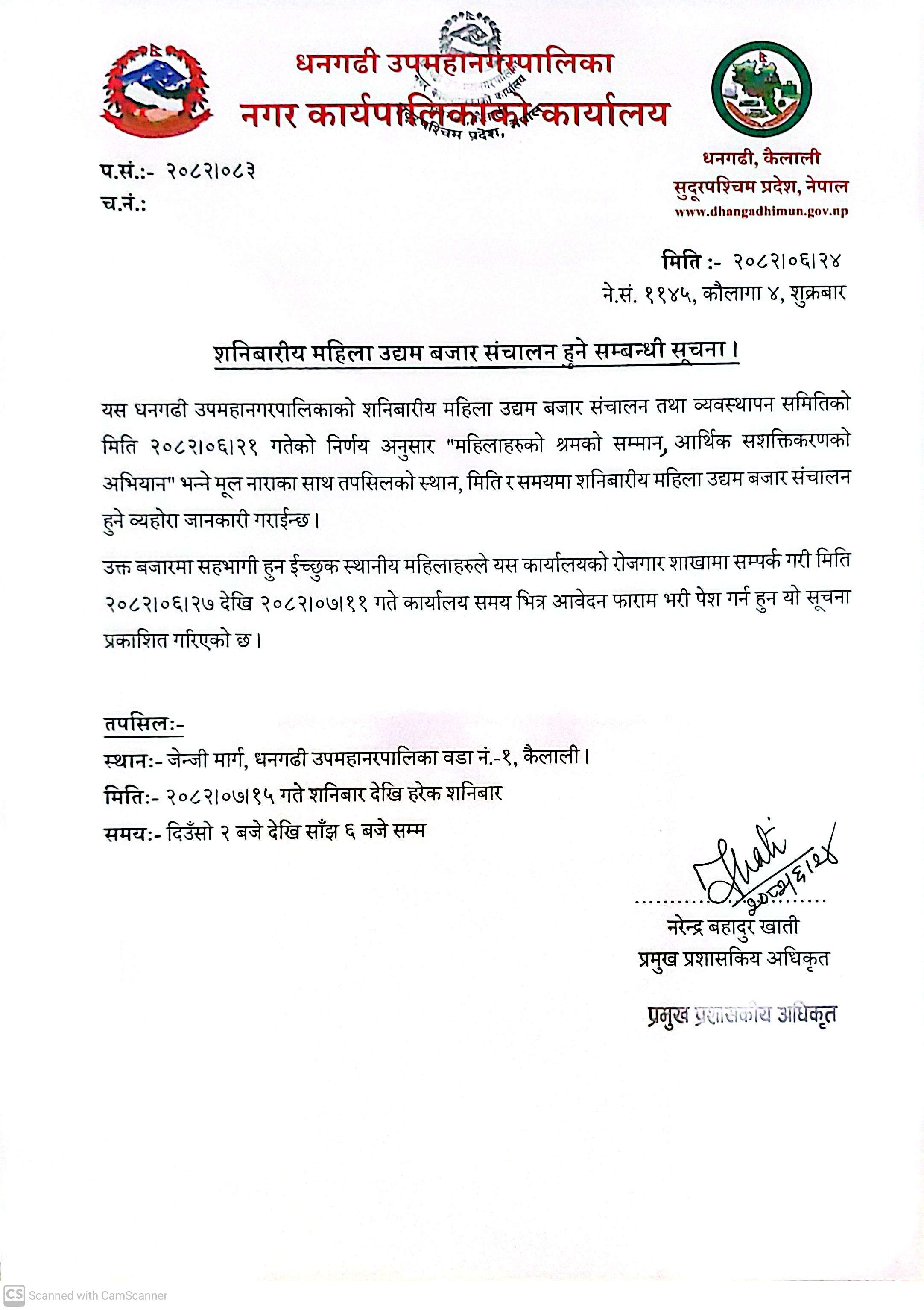 शनिवारीय महिला उद्यम बजार संचालन हुने सम्बन्धी सूचना ।