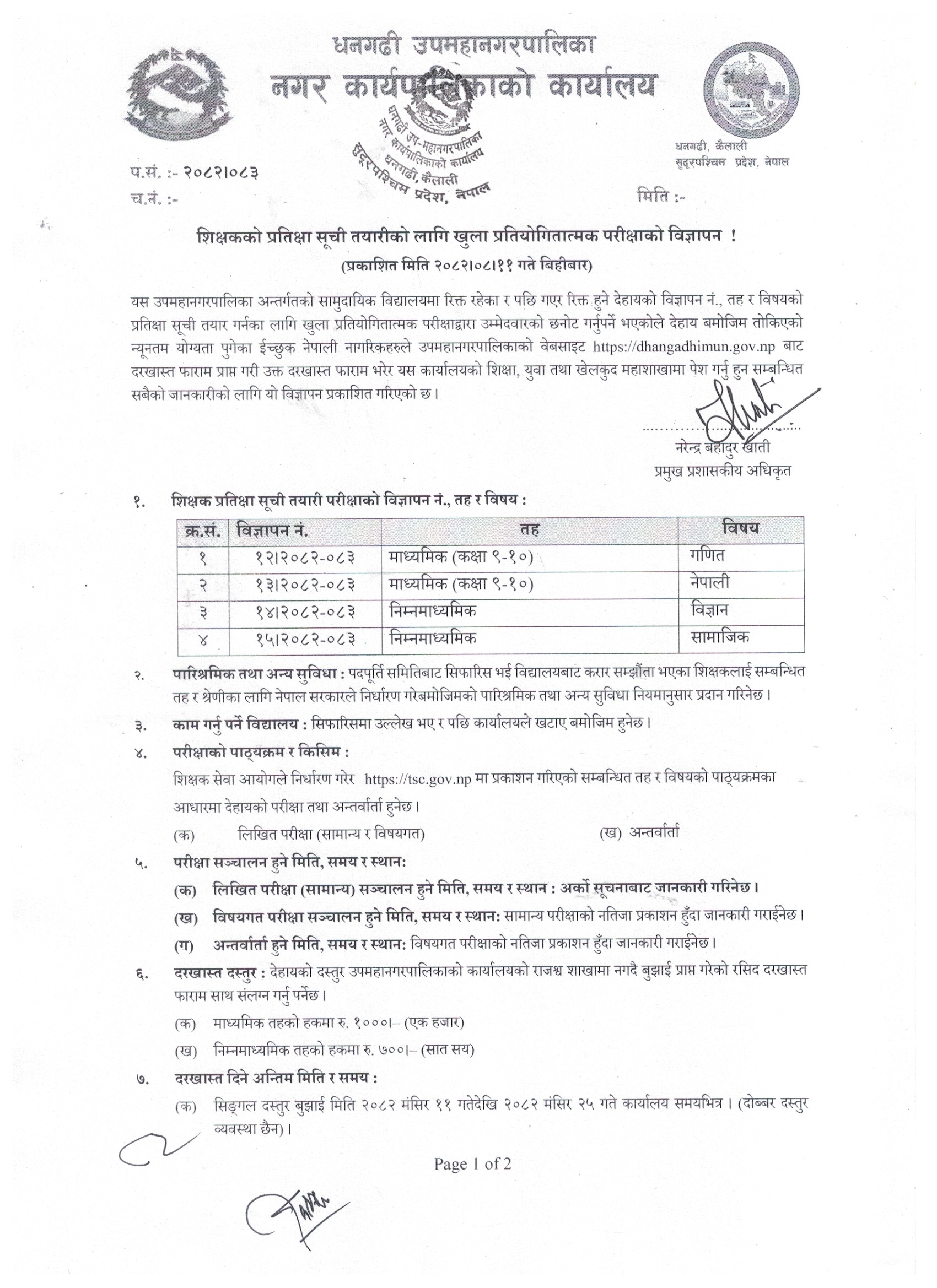 धनगढी उपमहानगरपालिकाको स्वामित्वमा रहेको कोठाहरुलाई बहालमा दिने सम्बन्धी सिलबन्दी दरभाउ पत्र आव्हानको १५ दिने सूचना