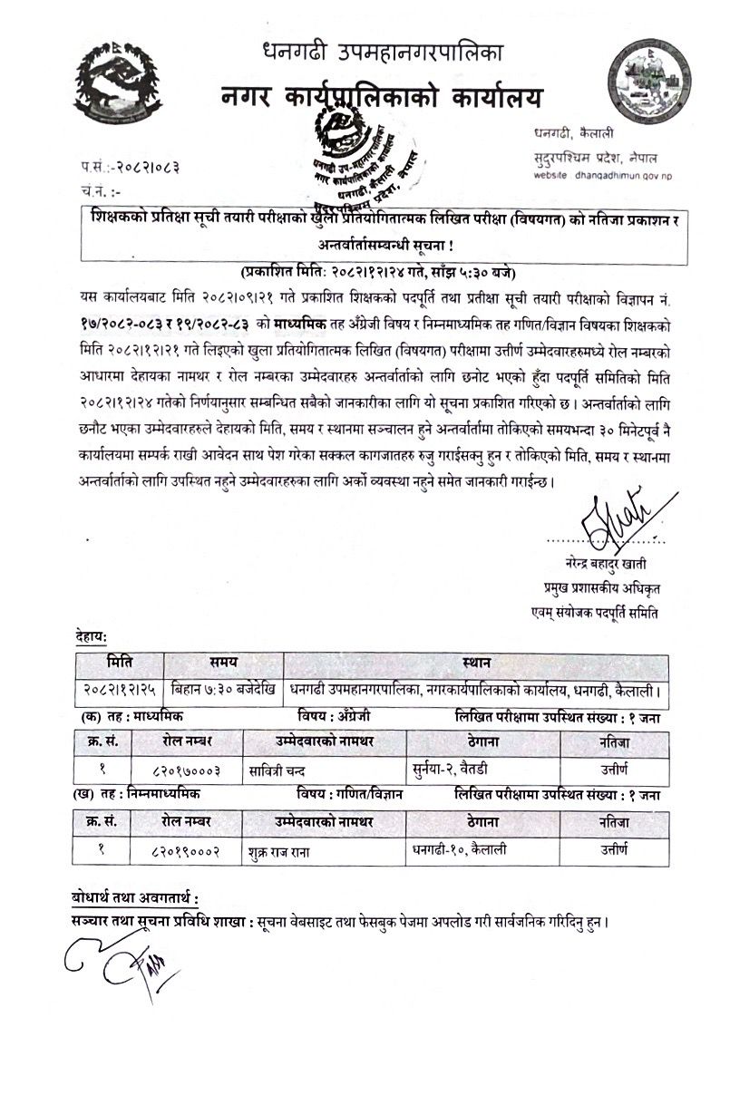 शिक्षकको प्रतिक्षा सूची तयारी परीक्षाको लिखित परीक्षा (विषयगत) को नतिजा प्रकाशन र अन्तर्वार्तासम्बन्धी सूचना !