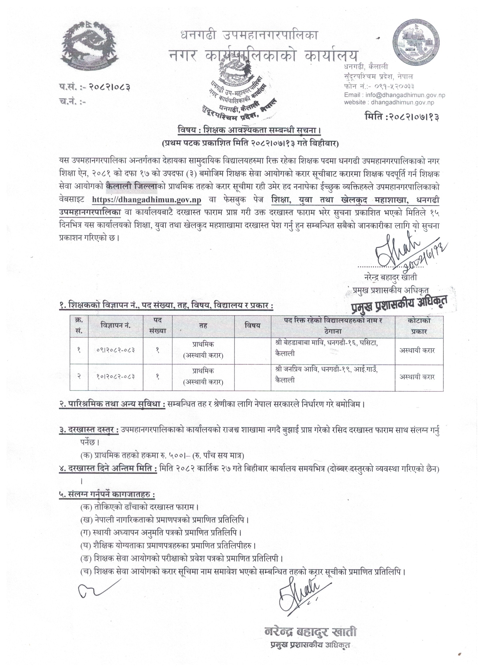 शिक्षक सेवा आयोगको करार सूचीबाट करारमा शिक्षक पदपूर्ति गर्न शिक्षक सेवा आयोगको कैलाली जिल्लाको प्राथमिक तहको करार सूचीमा रही उमेर हद ननाघेका ईच्छुक व्यक्तिहरुबाट शिक्षक आवश्यकता सम्बन्धी सूचना ! (प्रथम पटक प्रकाशित मिति २०८२।०७।१३ गते बिहीबार)