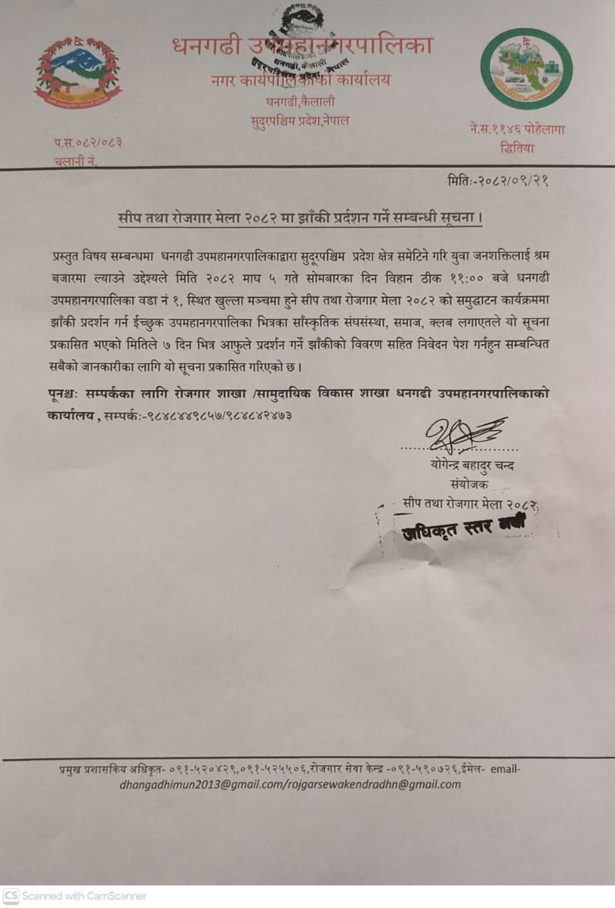 सीप तथा रोजगार मेला २०८२ मा झाँकी प्रदर्शन गर्ने सम्बन्धी सूचना ।