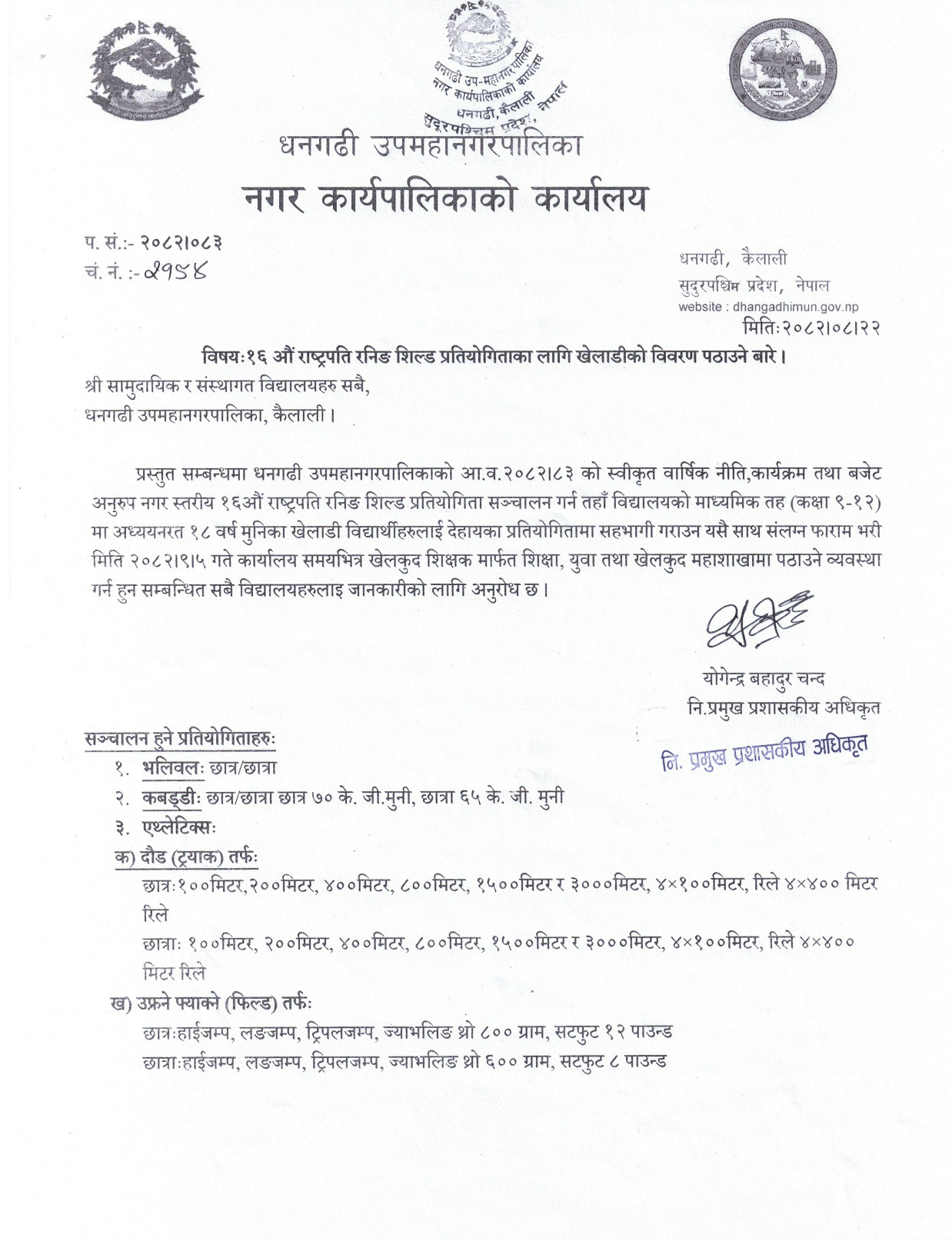 १६ औं राष्ट्रपति रनिङ शिल्ठ प्रतियोगिताका लागि खेलाडीको विवरण पठाउने बारे