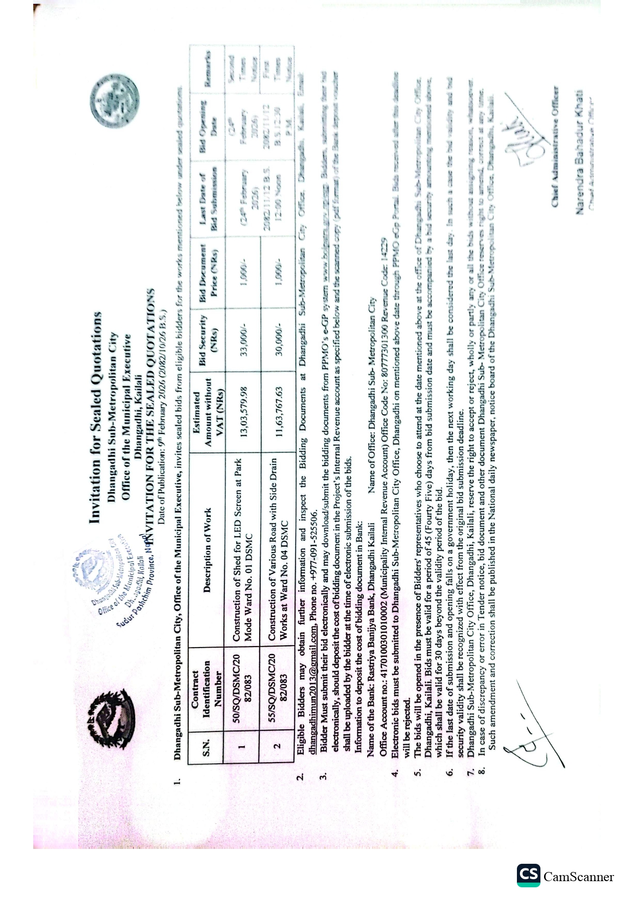 Invitation for the sealed quotations [Contract Id no. 50, 55]