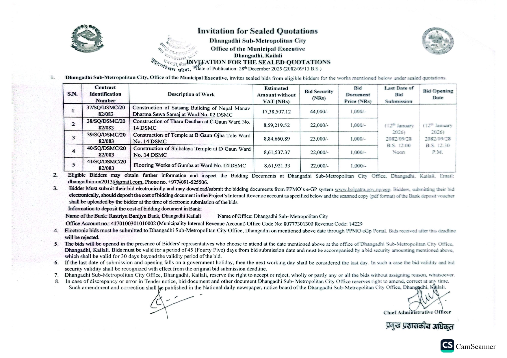 » Invitation for the sealed quotations [ID no. 37-41] [For various work at ward no. 02, 14 C, 14 B, 14 D]