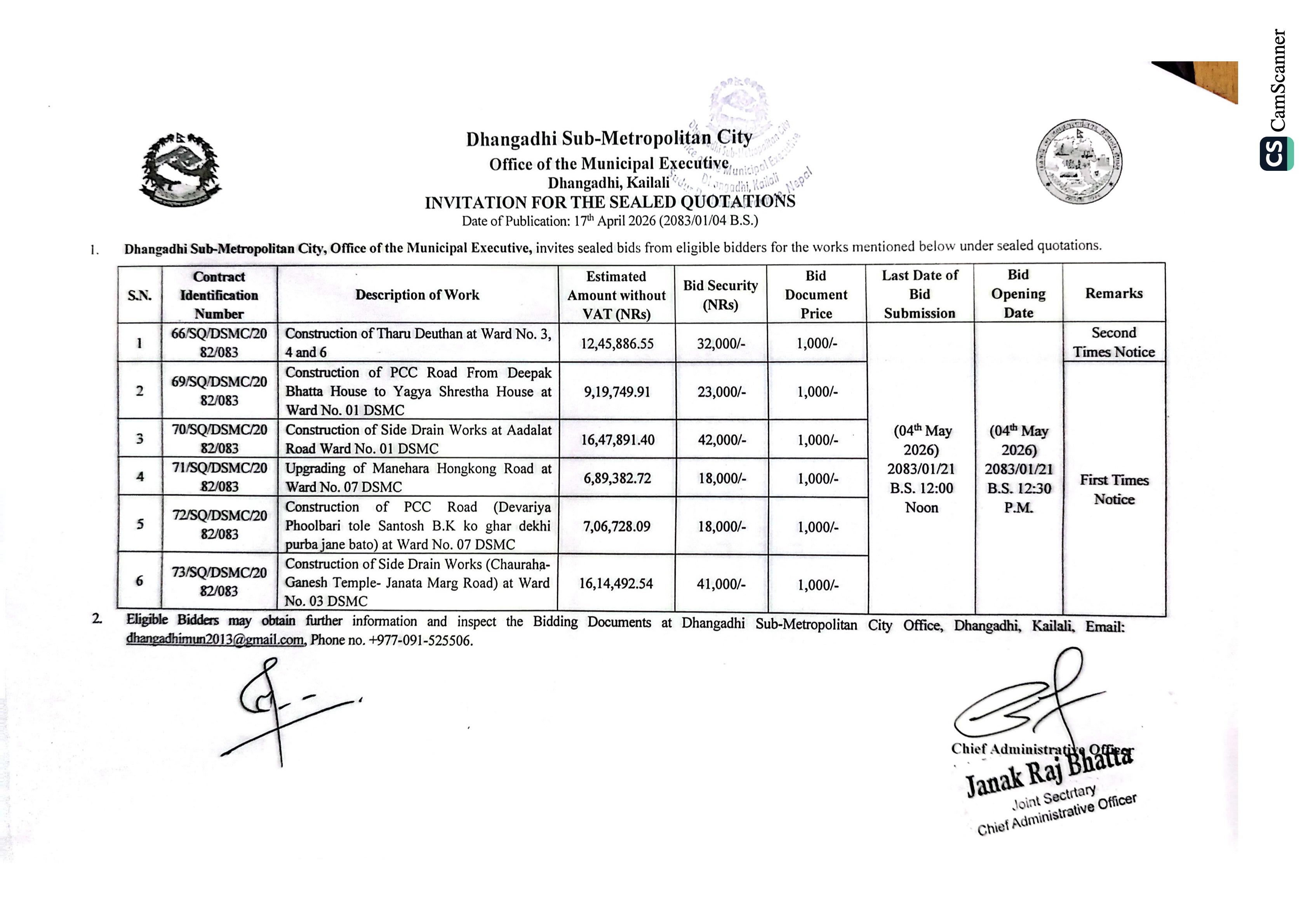 Invitation for the Sealed Quotations (Various Construction Works)